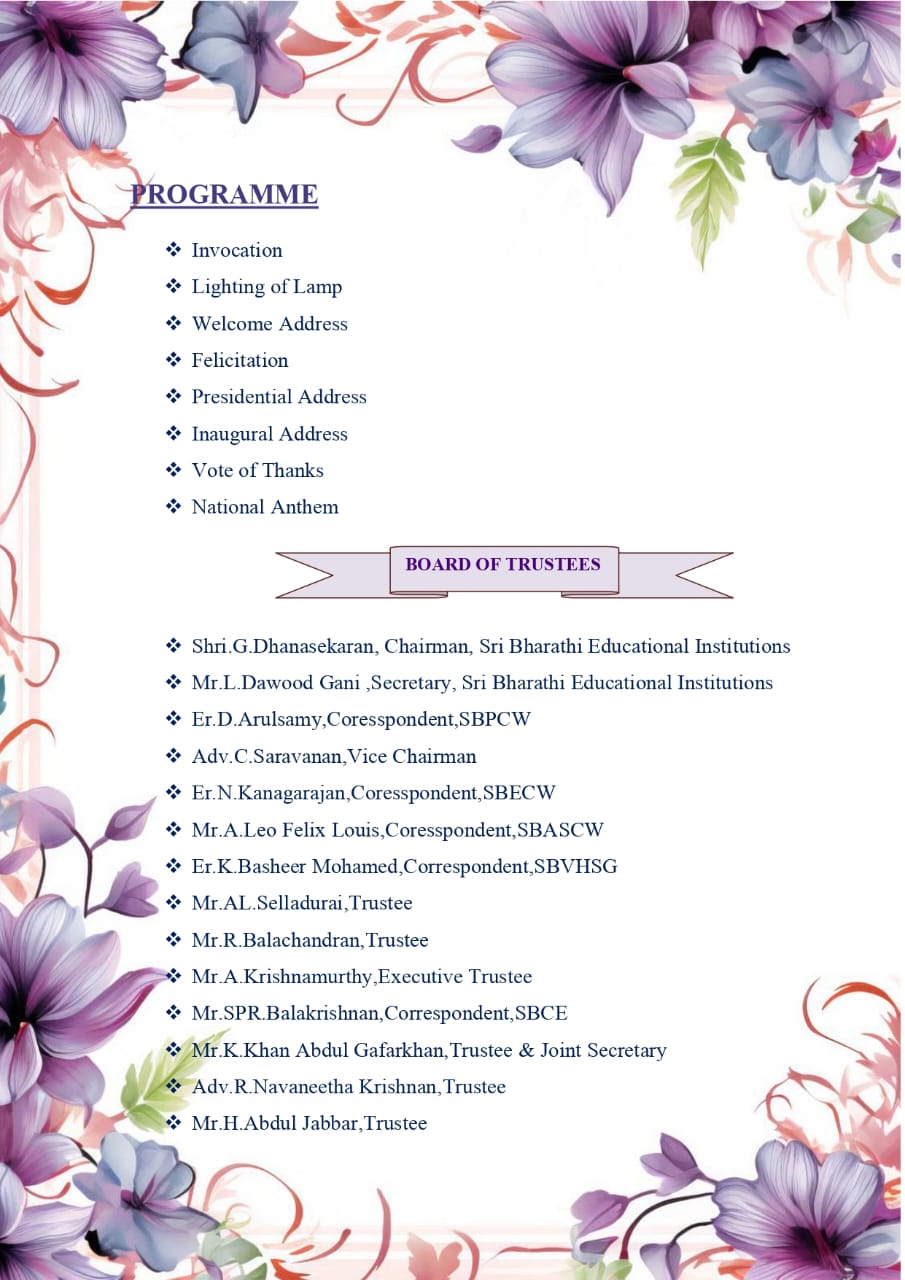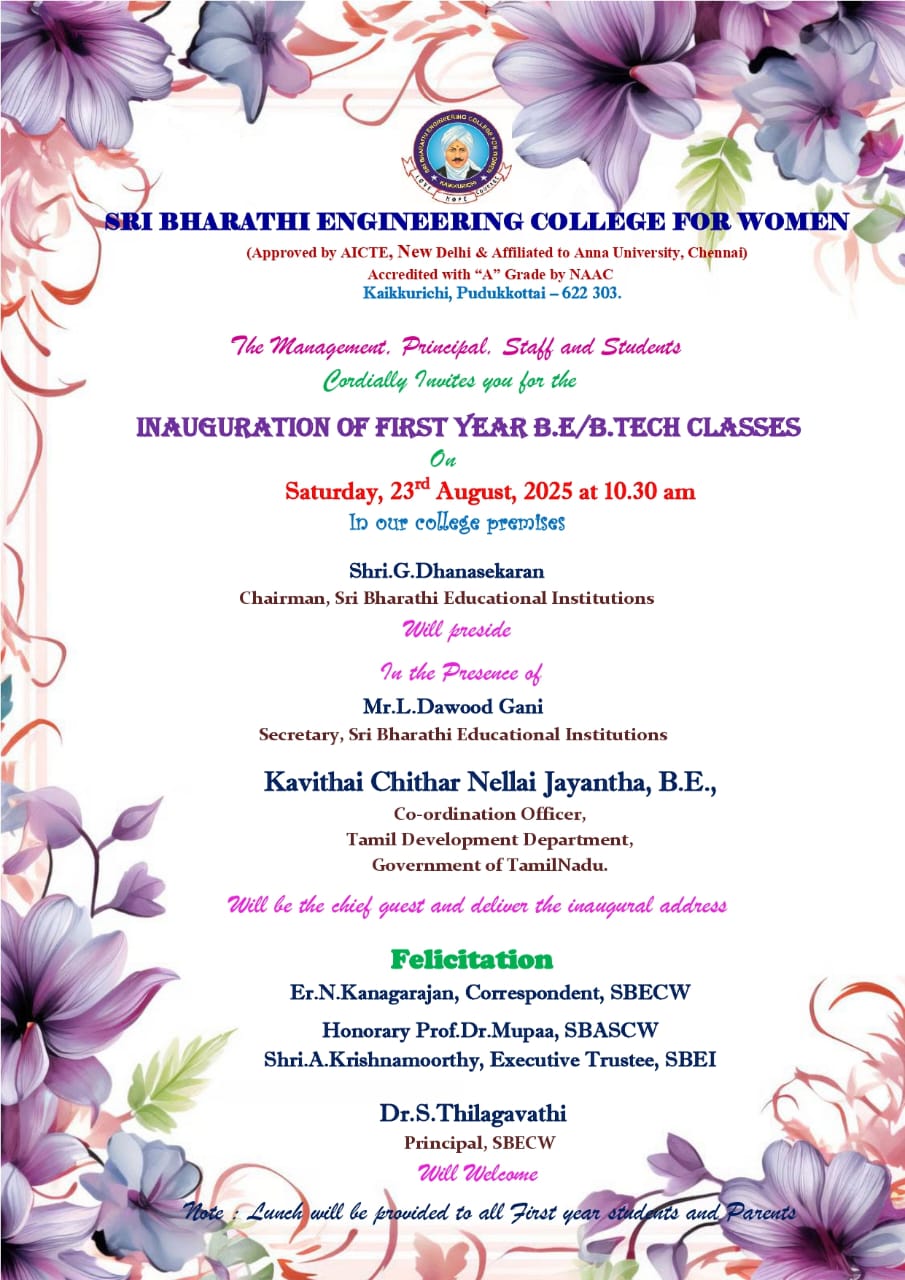 Women's education is very important for the country to fully develop. Educated women are the weapon that yields a positive impact on Indian society through their contribution at home and in professional fields. They are the reason for the improved economy in the country as well as society. The women's education in ancient India was quite good but in the middle age, it deteriorated because of many restrictions against women. Sri Bharathi Engineering College for Women is the first Engineering College started only for women in Pudukkottai District. This college was seeded by Sri Bharathi Educational Trust in the year 2009 with five B.E/B.Tech courses to inculcate quality education for rural women. This institute is located on the outskirts of Pudukkottai, about 6 kilometers from Pudukkottai and almost in a rural atmosphere.